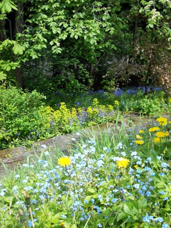 Bluebells against the long bottom wall. I think the deep blue says these come from seed through several years, not from old bulbs. Here and there we have white flowers which I think suggests ancient bulbs still flowering.